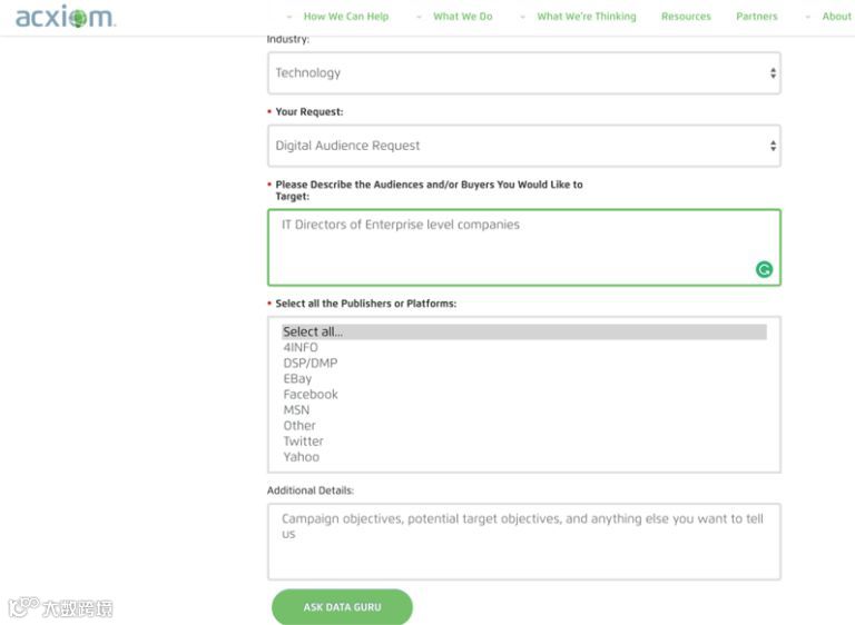 点击之后,进入到一个联系人表单询问必要的信息。这是整个过程中最重要的部分,因为有两个表单字段会提供Acxiom所需的信息,以构建尽可能多的自定义用户。在这里,您可以从第1步中完成的客户角色研究中收集到的所有信息,并将其应用到这个过程中。