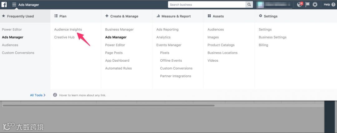 首先,来到我们的Facebook广告Ads Manager,在你的屏幕左上角你会看到“Ads Manager”。点击这个,你会看到“All Tools”按钮的右下角的Ads Manager标签。从那里,你将看到“Plan”类别下的Audience Insights按钮。