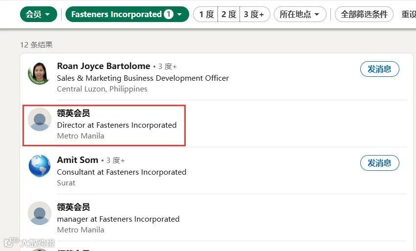 复制 “Director at Fasteners Incorporated” 到谷歌搜索,要加上双引号,这样就能在结果中找到想要寻找的对应职位的关键人。