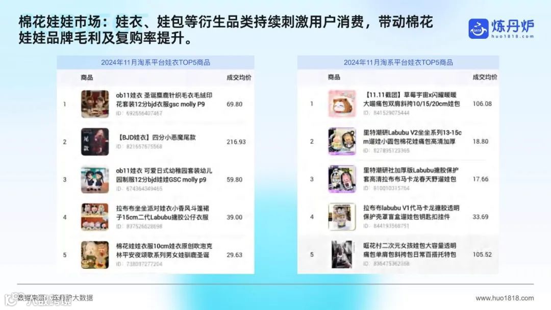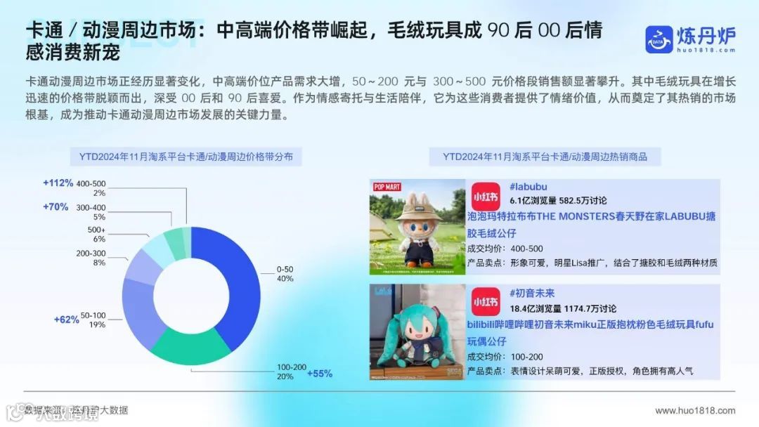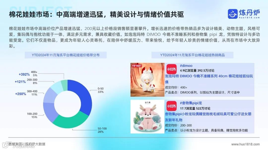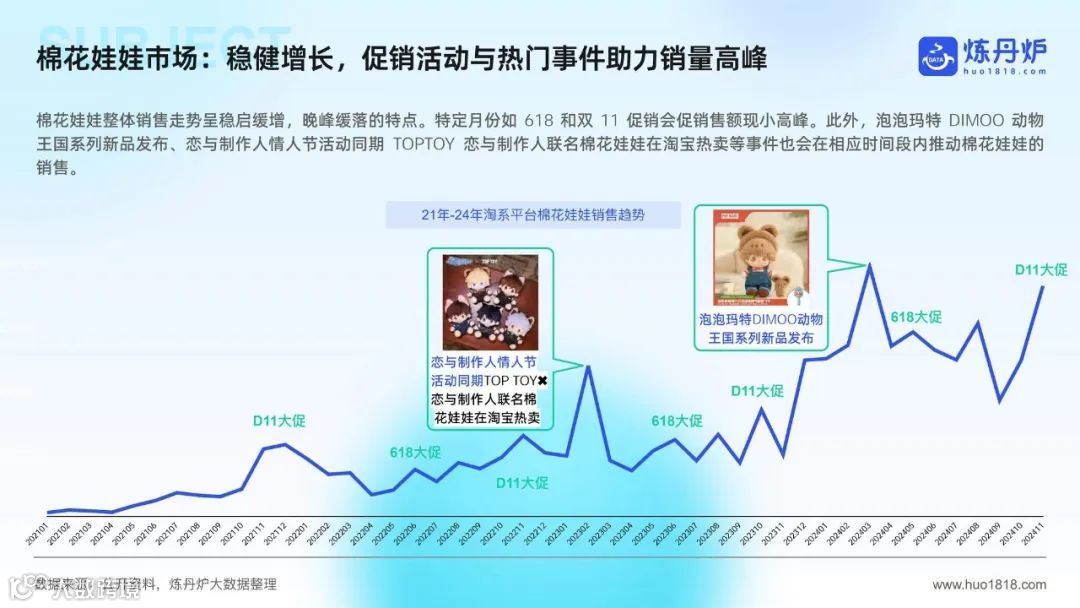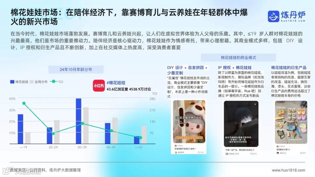 棉花娃娃市场在陪伴经济下迅速崛起,尤其是年轻群体中。DIY设计、IP授权和衍生产品成为其商业模式的主要组成部分,社交媒体上的热度高,深受消费者喜爱。