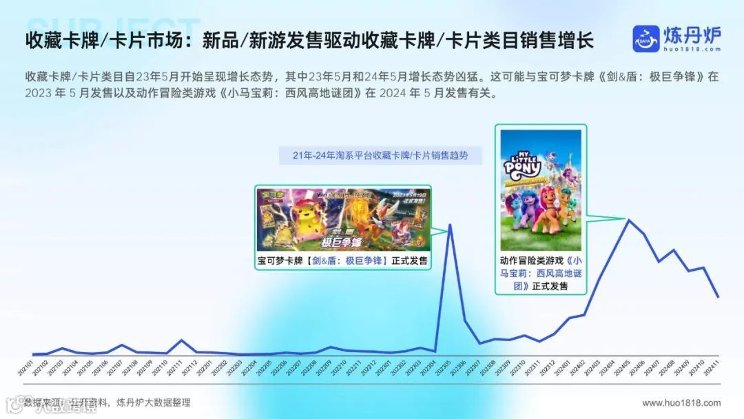 收藏卡牌和卡片类目自2023年5月开始呈现增长态势,新品新游发售成为主要驱动力。