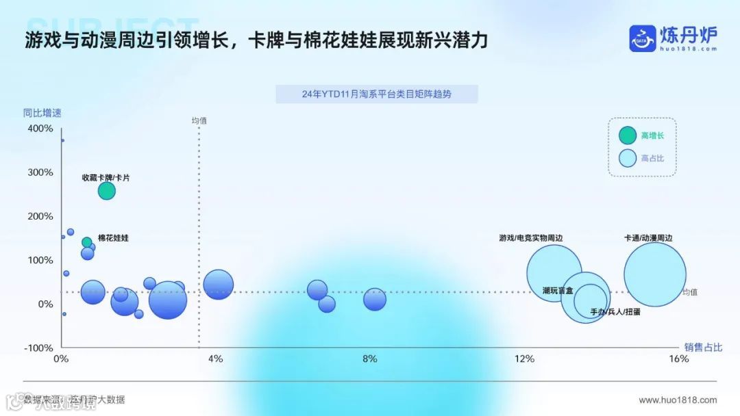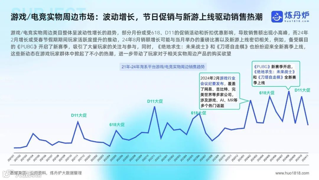 在潮玩行业细分市场中,游戏与动漫周边引领增长,卡牌与棉花娃娃展现新兴潜力。卡通和动漫周边市场受促销活动和展会影响,销售额出现小高峰。游戏和电竞实物周边市场则受节日促销和新游上线驱动。