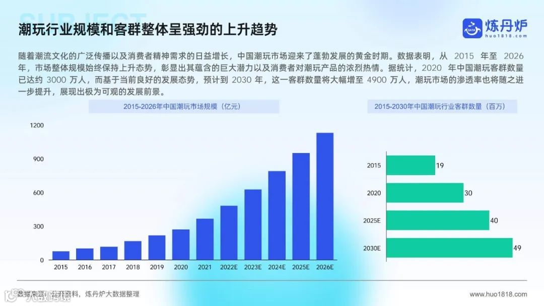 2015年至2026年,中国潮玩市场规模始终保持上升态势。2020年中国潮玩客群数量已达约3000万人,预计到2030年,这一数字将增至4900万人,市场渗透率进一步提升。