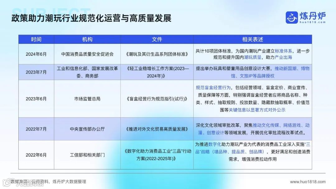 2024年6月,中国消费品质量安全促进会发布《潮玩及其衍生品系列团体标准》,为国内潮玩产业建立标准体系,规范和提升国内潮玩质量,助力产业出海。一系列政策的出台,为潮玩行业的规范化运营和高质量发展提供了有力支持。