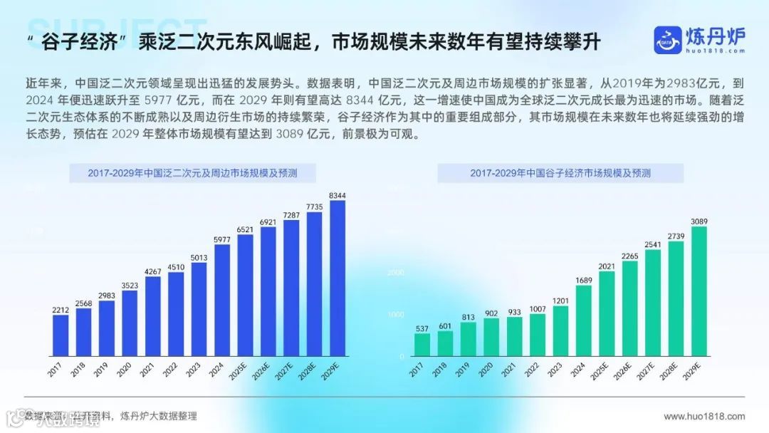 中国泛二次元及周边市场规模的扩张显著,谷子经济作为其中的重要组成部分,市场规模在未来数年也将延续强劲的增长态势。预估在2029年整体市场规模有望达到3089亿元。