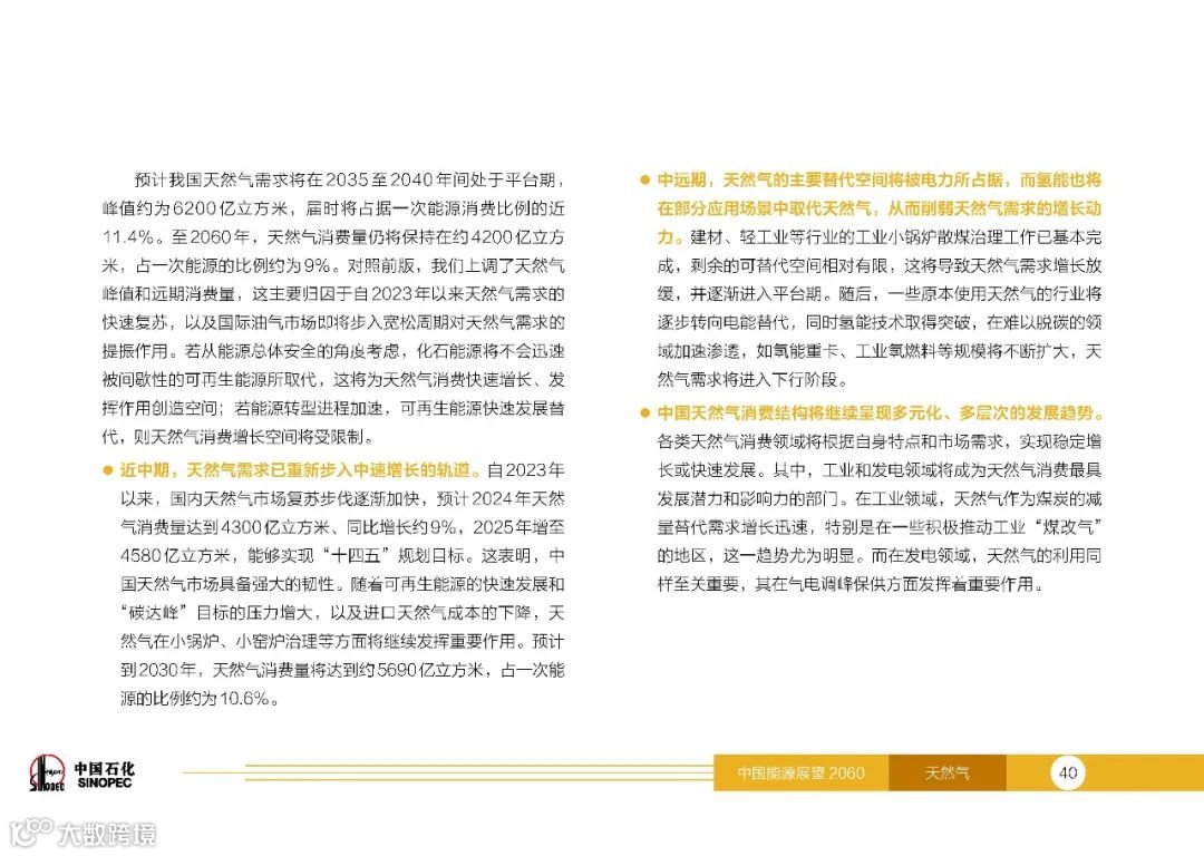 2024年,中国天然气消费总量达到4300亿立方米,预计“十五五”期间再增1100多亿立方米,并于2035至2040年来到峰值平台期,峰值消费量约为6200亿立方米。到2060年,中国天然气消费总量将回落到大约4200亿立方米。