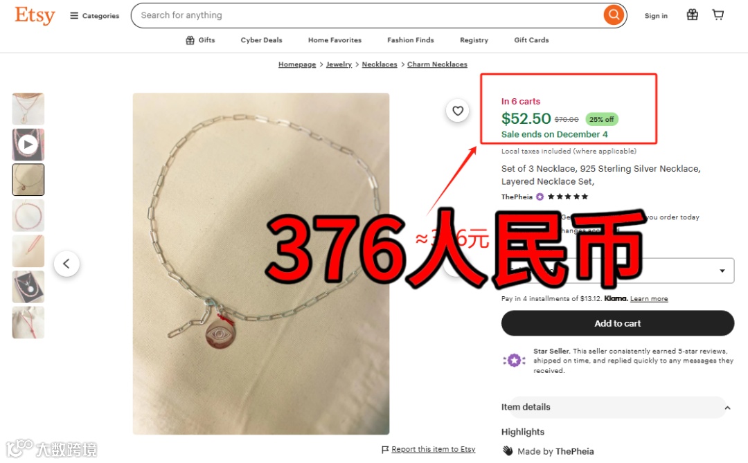 看看这个链条项链,52USD折合人民币376元的链子,在1688上面售价4.5元,几十倍的差价,利润空间非常大。