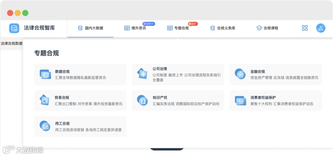 在处理日常法务事务时,及时获取和理解最新法规及监管政策至关重要。iLaw法律合规智库针对合规领域进一步细分,推出「专题合规」模块,涵盖数据合规、公司治理、金融合规等七大板块,并以T+1的时效进行更新,满足企业对国内外合规资讯的需求。