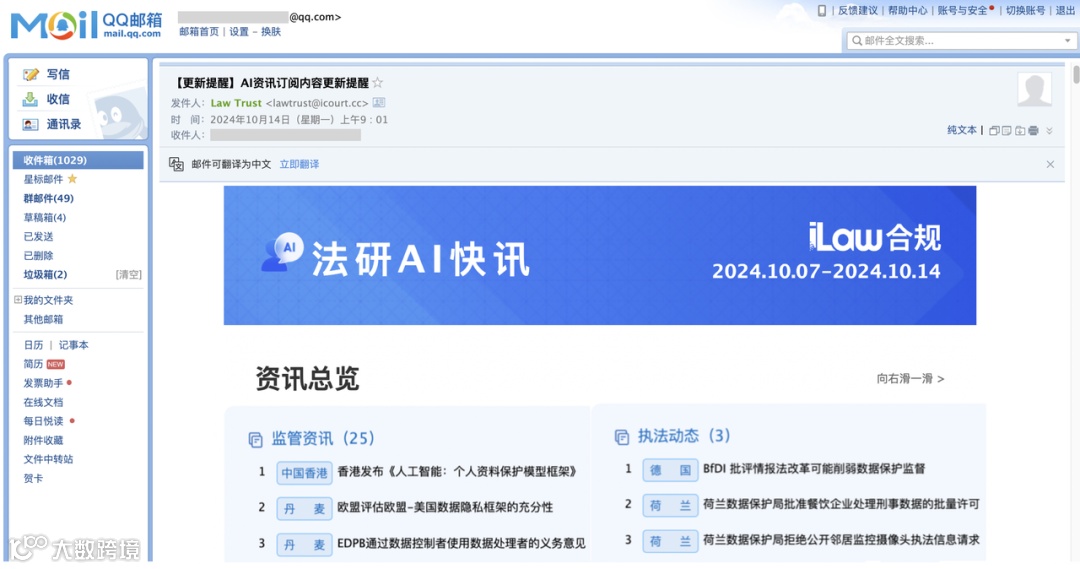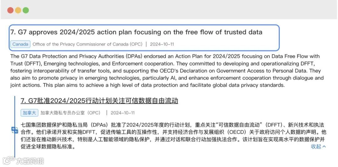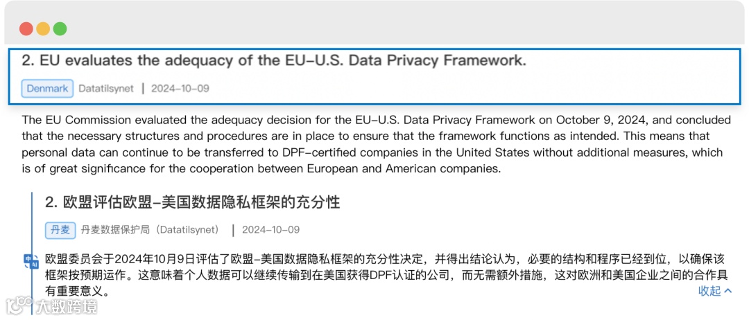 其中,数据合规专题新增法研AI快讯功能,聚合海外数据隐私信息,通过AI智能分析与汇总,大幅提升资讯获取效率,使用户在几秒内即可了解最新合规进展。