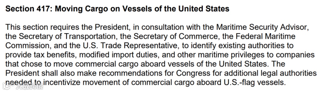 除了美国旗船只享有优先靠泊权,对于使用美国船的进口商政府有各种奖励。法案建议美国总统跟相关政府部门协商,在现行法律法规赋予的权利下,研究如何对使用美国船的货主提供税务优惠,进出口税率减免及其他优惠政策。先是大棒,接着就塞萝卜了。