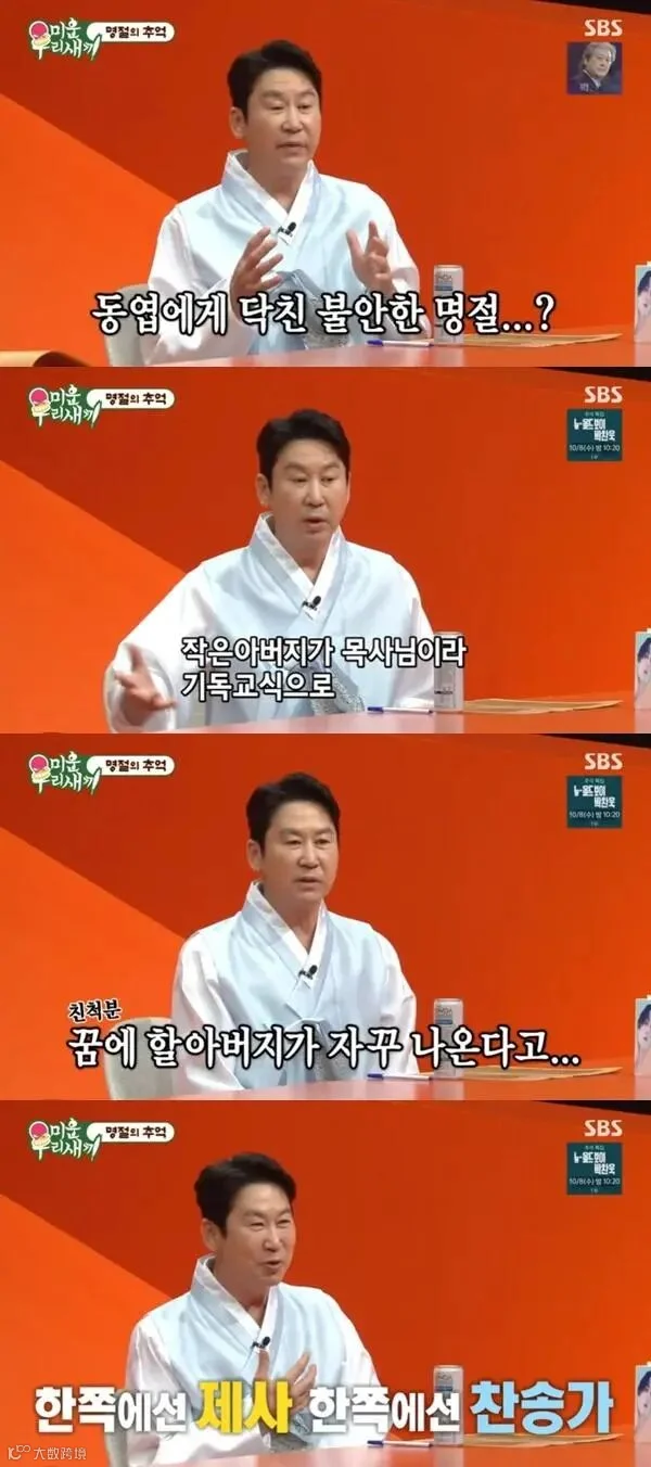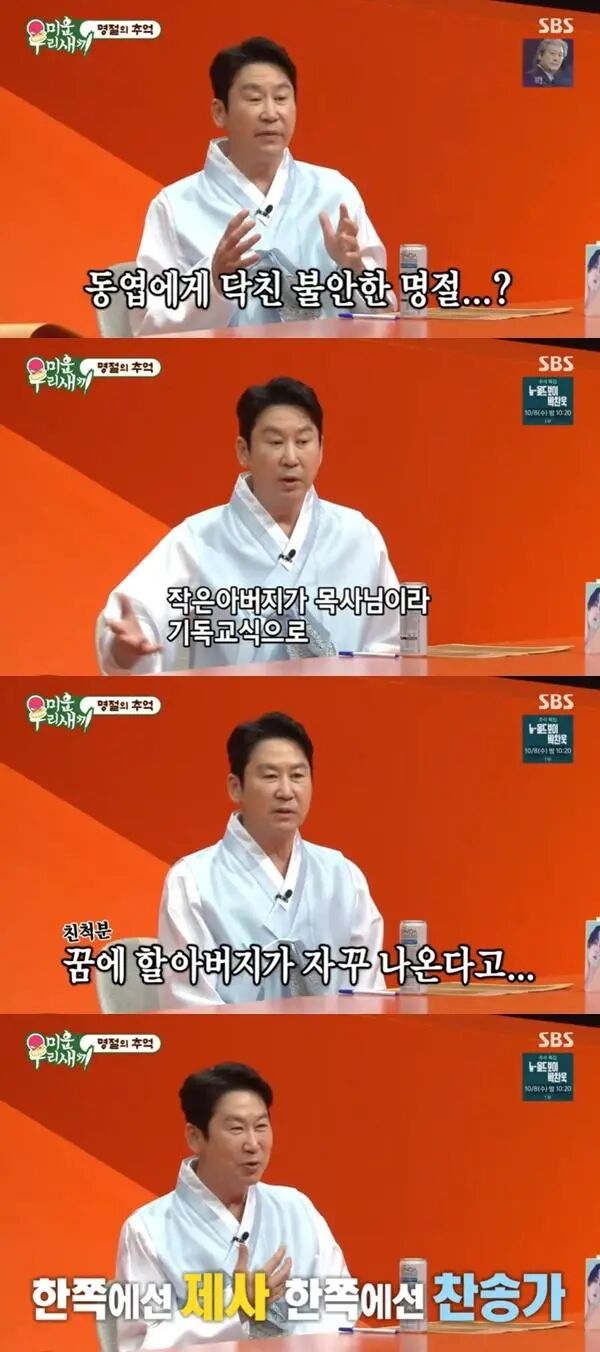 SBS ‘미운 우리 새끼’ 이어 신동엽은 “예전에 불안한 명절을 보냈던 때가 있었다. 중학생 때다. 할아버지 할머니 제사를 지내는데 작은 아버지가 목사님이고 어머니도 교회를 다녀서 기독교식으로 하자. 그런데 어느 분이 꿈에 자꾸 할아버지가 나와서 기독교식으로 하면 안 된다고”라며 집안 어른들 사이 제사 방법 갈등을 말했다.