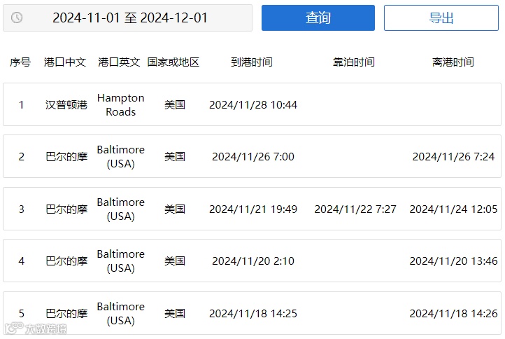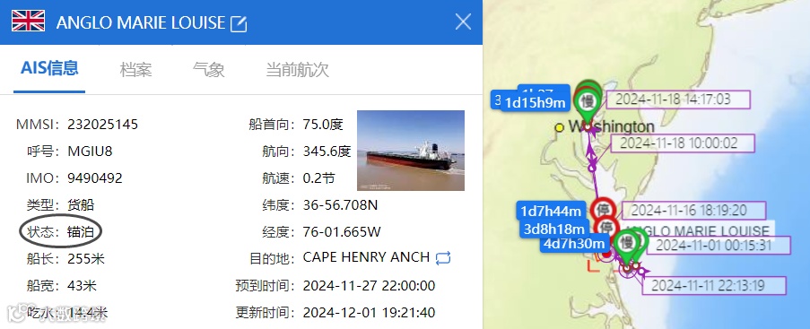 根据最新AIS(自动识别系统)数据显示,直至12月1日晚19点21分,该船仍处于“锚定”状态,暂未有离港或移动迹象。