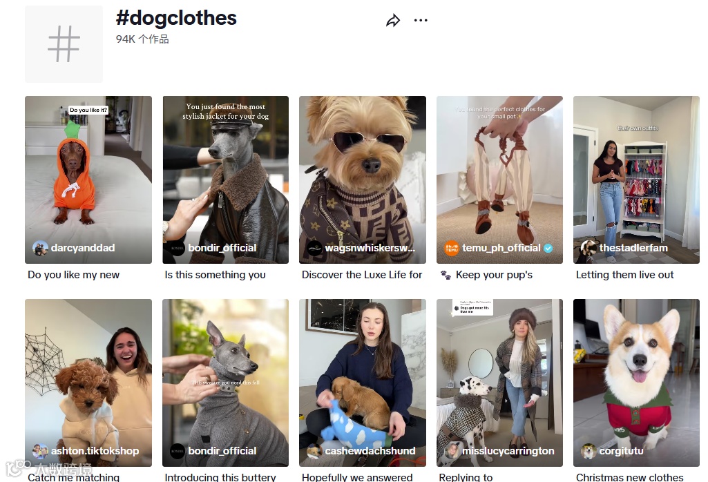 TikTok上带有#dog clothes标签下累计发布视频超9万条,展示了不同种类宠物服饰,如宠物毛衣、宠物圣诞头饰、宠物围巾等。