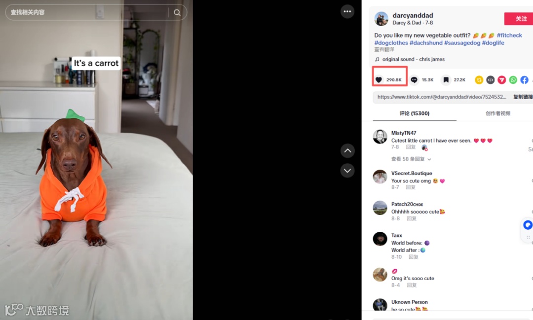 其中,一条关于狗狗穿“胡萝卜”衣服的视频获得29.08次点赞,180万观看,视频中,狗狗跟随音乐节奏穿着衣服在跳舞,看起来很滑稽,这一场景引起了众多观看者的讨论,在评论区表示对这款宠物服饰的赞美,更有人直接询问如何购买这款狗狗服饰,为这一产品带来了可观的销量。