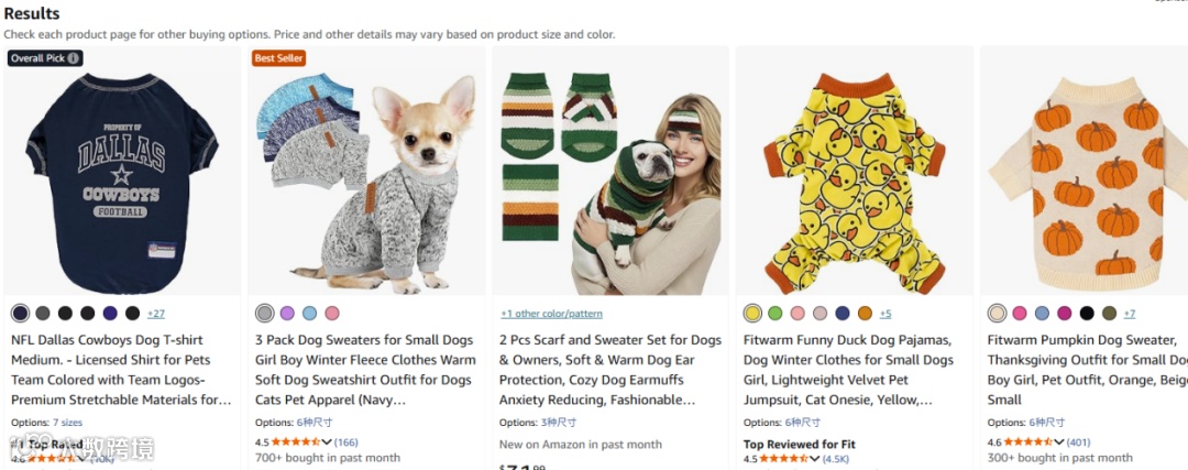 同时,从亚马逊上多款热销宠物服饰来看,“保暖”、“带牵引绳”、“高弹力”等是商品重点功能体现。