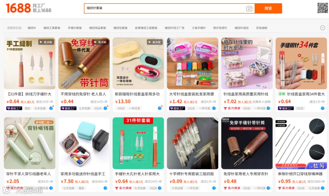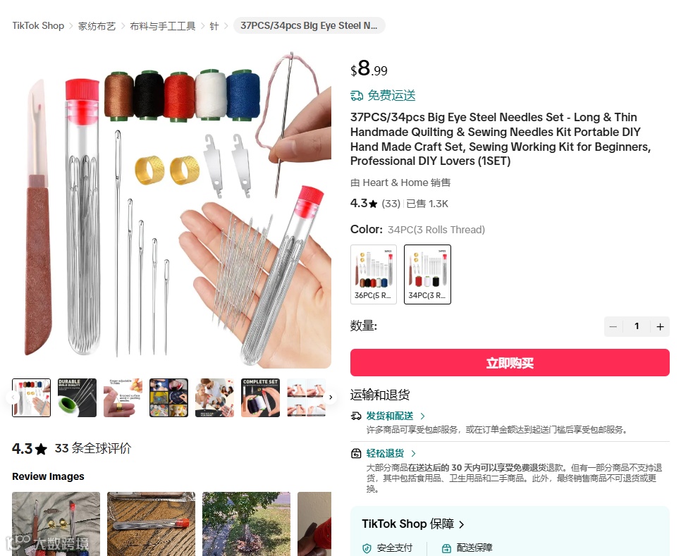TikTok美区店铺推出的一款大眼钢针套装,售价8.99美元,包含34根不同大小的钢针、缝纫线及工具。而国内某批发平台,一套缝纫针套装仅需几毛钱。