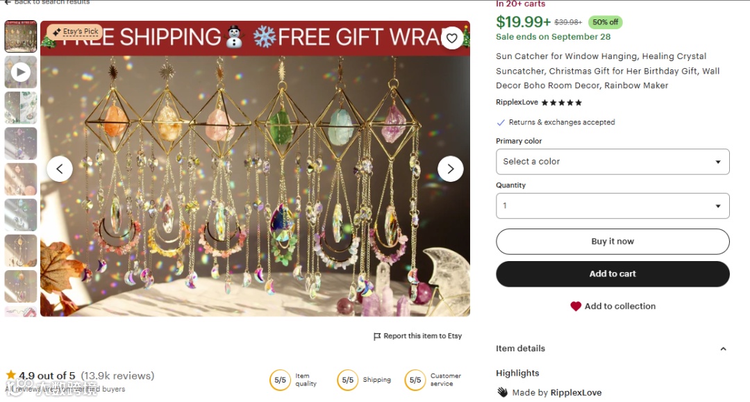 在Esty上,一款售价19美元的单个水晶风铃,卖出5万+单,总销售额达99.5万美金。另一款售价为150美元的较大型的水晶风铃,售出1.17万单,总销售额超175.5万美元。