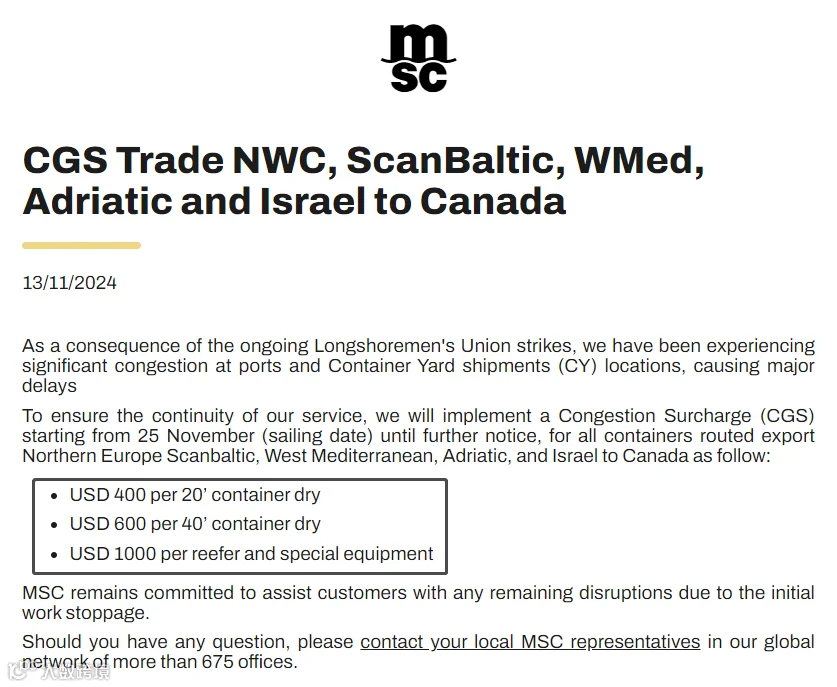 为此,地中海航运(MSC)宣布自11月25日起,针对所有从北欧、斯堪的纳维亚半岛(Scanbaltic)、西地中海、亚得里亚海以及以色列始发至加拿大目的地的货物,将额外征收拥堵附加费(CGCS),直至另行通知为止。详情如下: