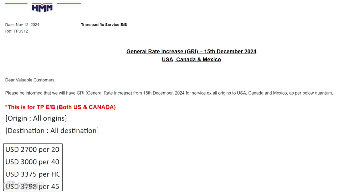 韩新海运从2024年12月15日起对所有始发地到美国、加拿大和墨西哥的服务实行 GRI(全面费率上涨)。详情如下:
