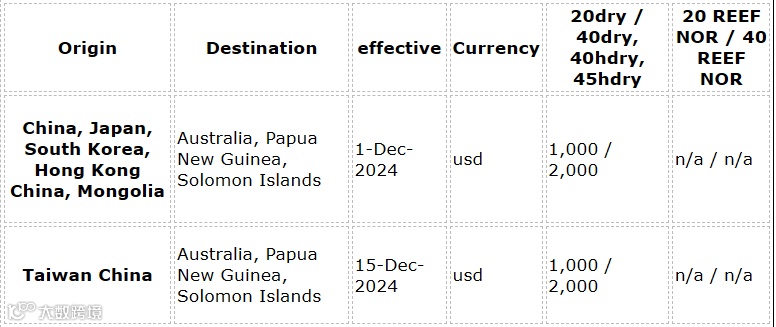 除此之外,马士基正在调整旺季附加费,适用范围为:中国/中国香港/日本/南韩/蒙古至新西兰/斐济岛/法属波利尼西亚,生效日期为2024年12月1日。