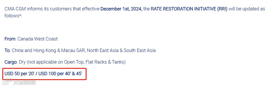 达飞轮船(CMA CGM)近日也通知其客户,自2024年12月1日起,将对加拿大西海岸至中国、中国香港、中国澳门、东北亚和东南亚实施一项费率恢复倡议(RRI)。