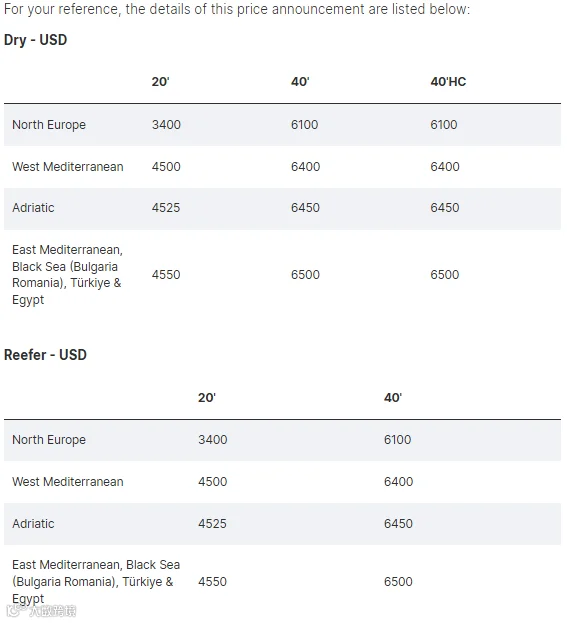 此轮调整覆盖了所有采用20英尺和40英尺标准尺寸的干货以及冷藏集装箱运输,包括超高箱型,上述变更将于2024年12月1日正式生效。