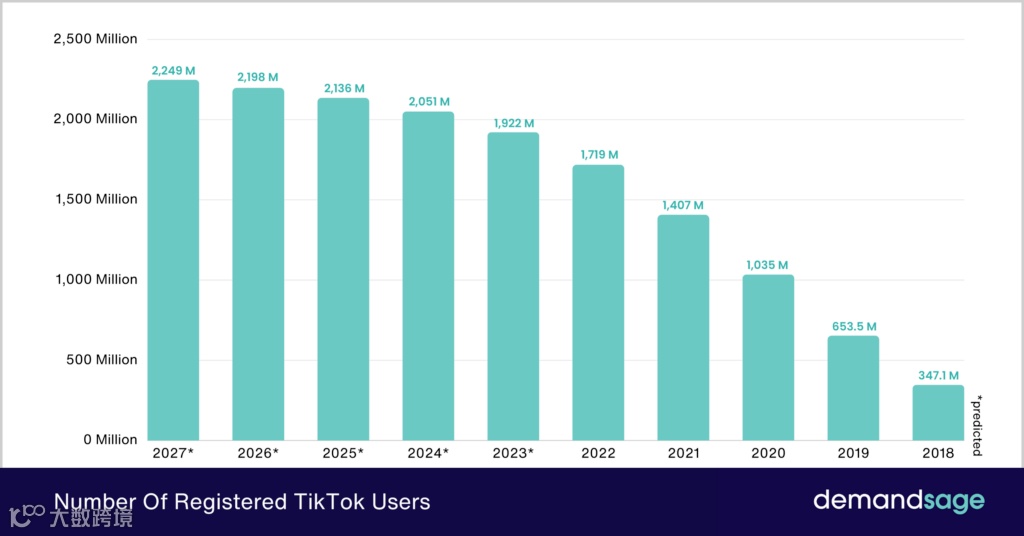 据了解,截至2024年4月份,TikTok在全球已经拥有15.6亿月活跃用户。在注册用户数量上,预计到2024年,TikTok在全球将拥有20.5亿注册用户,到2027年这一数字或将达到22.5亿。目前,TikTok的总下载量已经超过49.2亿次。
