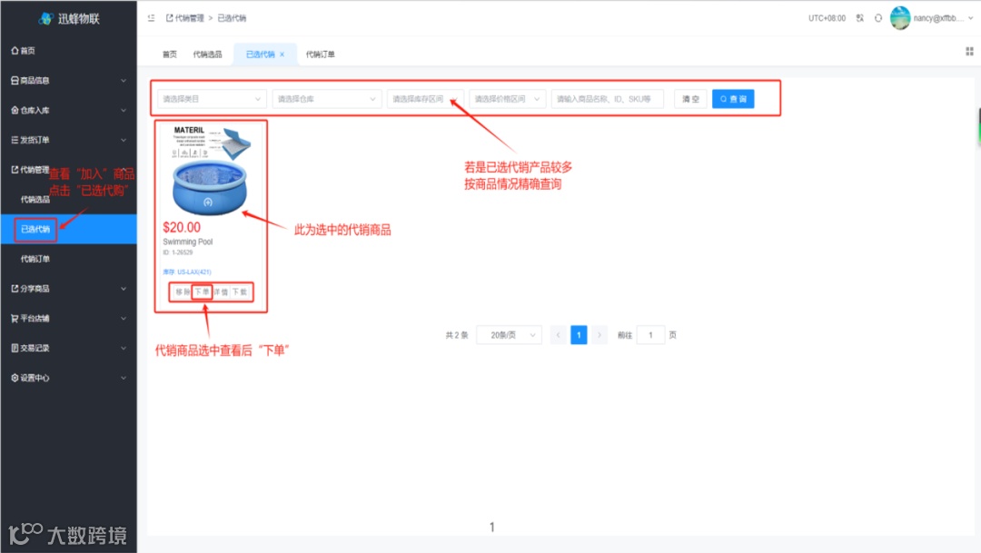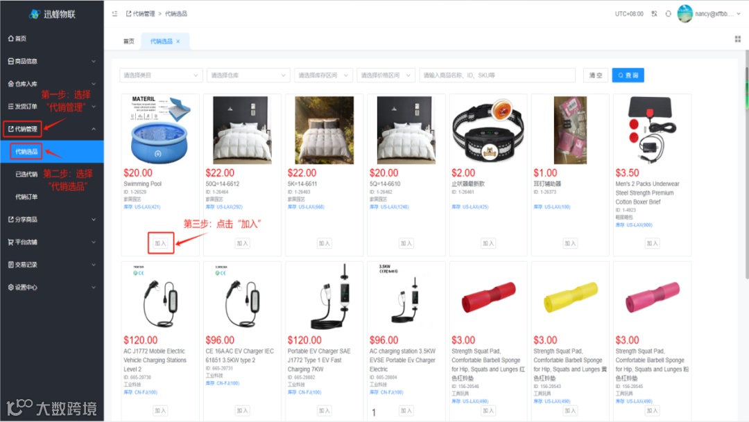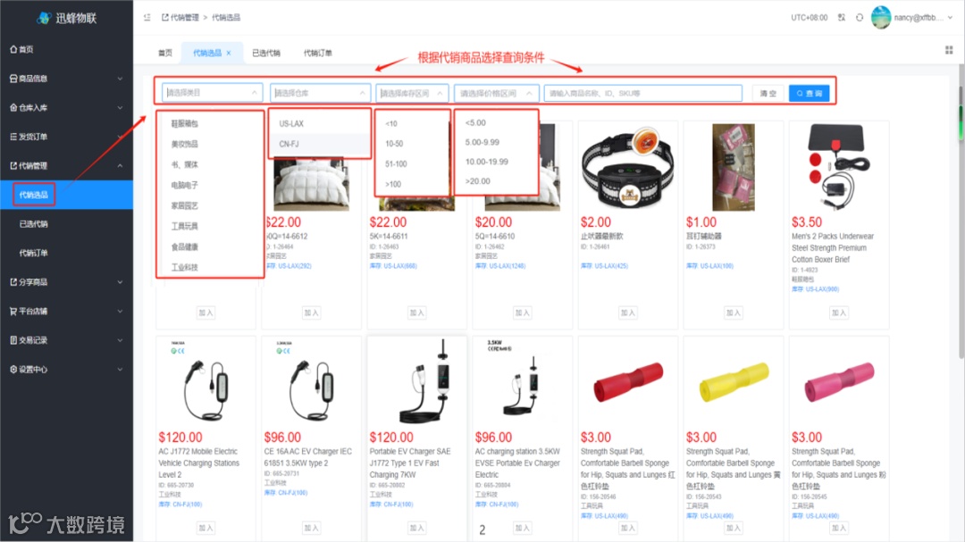 第二步:卖家在迅蜂系统进行“代销选品”,根据您的选品偏好,免费下载您计划销售的商品数据包(包含描述、图片),优化产品数据包资料后在亚马逊及eBay等电商平台进行刊登销售。