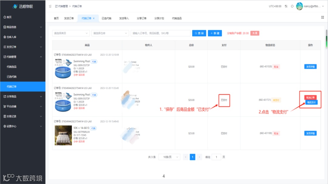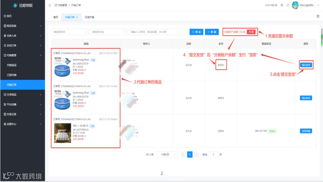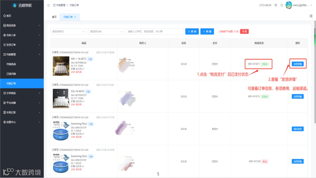 第四步:在系统充值,分别支付货款和物流费用。迅蜂海外仓接到您的下单请求后,在24小时内出物流跟踪号(卖家自行上传跟踪号到第三方平台),2-8天内即可妥投,订单完成。