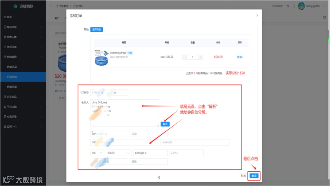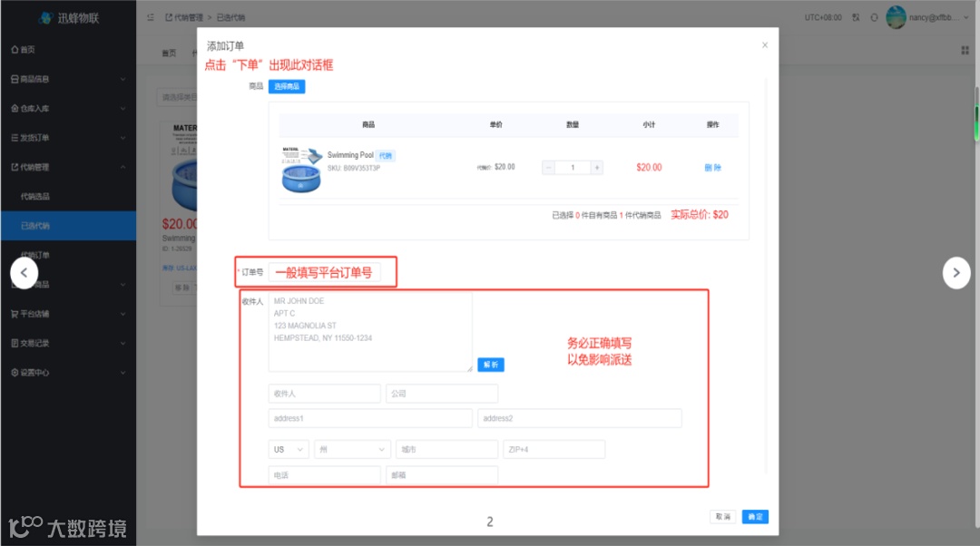 第三步:一旦亚马逊及eBay等电商平台出单后,卖家便可在迅蜂海外仓系统操作“代销下单”,根据每个平台订单,填入准确的收货信息和商品数量。