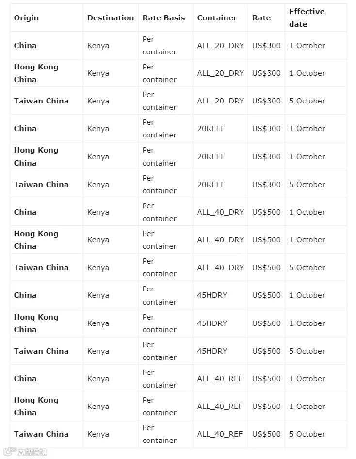 从中国、中国香港至肯尼亚,2024年10月1日生效;从中国台湾至肯尼亚,2024年10月5日生效。