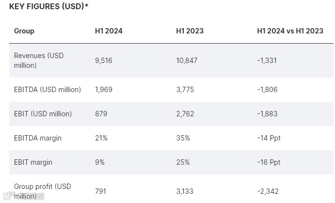 数据显示:2024年上半年,集团收入为95.16亿美元;集团EBITDA为20亿美元(18亿欧元);集团EBIT降至9亿美元(8亿欧元);集团利润降至8亿美元(7亿欧元)。
