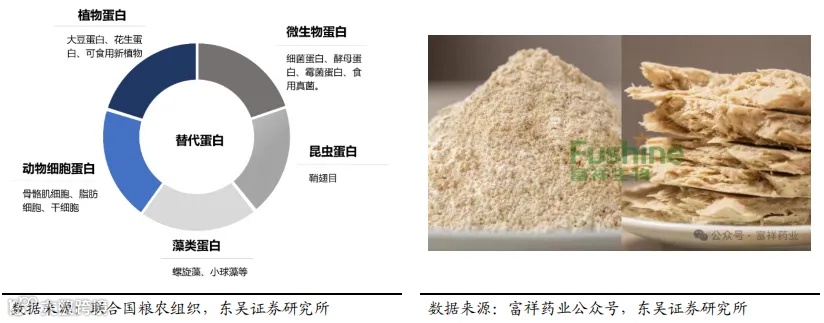 以富祥药业为例,其在2023年布局了替代蛋白中的微生物蛋白业务。其微生物蛋白采用合成生物技术,生产出优质绿色健康的蛋白食品原料,具有高蛋白、低脂肪、低糖、零胆固醇、高膳食纤维、无抗生素等特点,并在生产过程中无需巨量进口的大豆或玉米作为饲料,也无需广袤的耕种或养殖土地面积,还兼具不添加任何抗生素、不使用农药等优势。