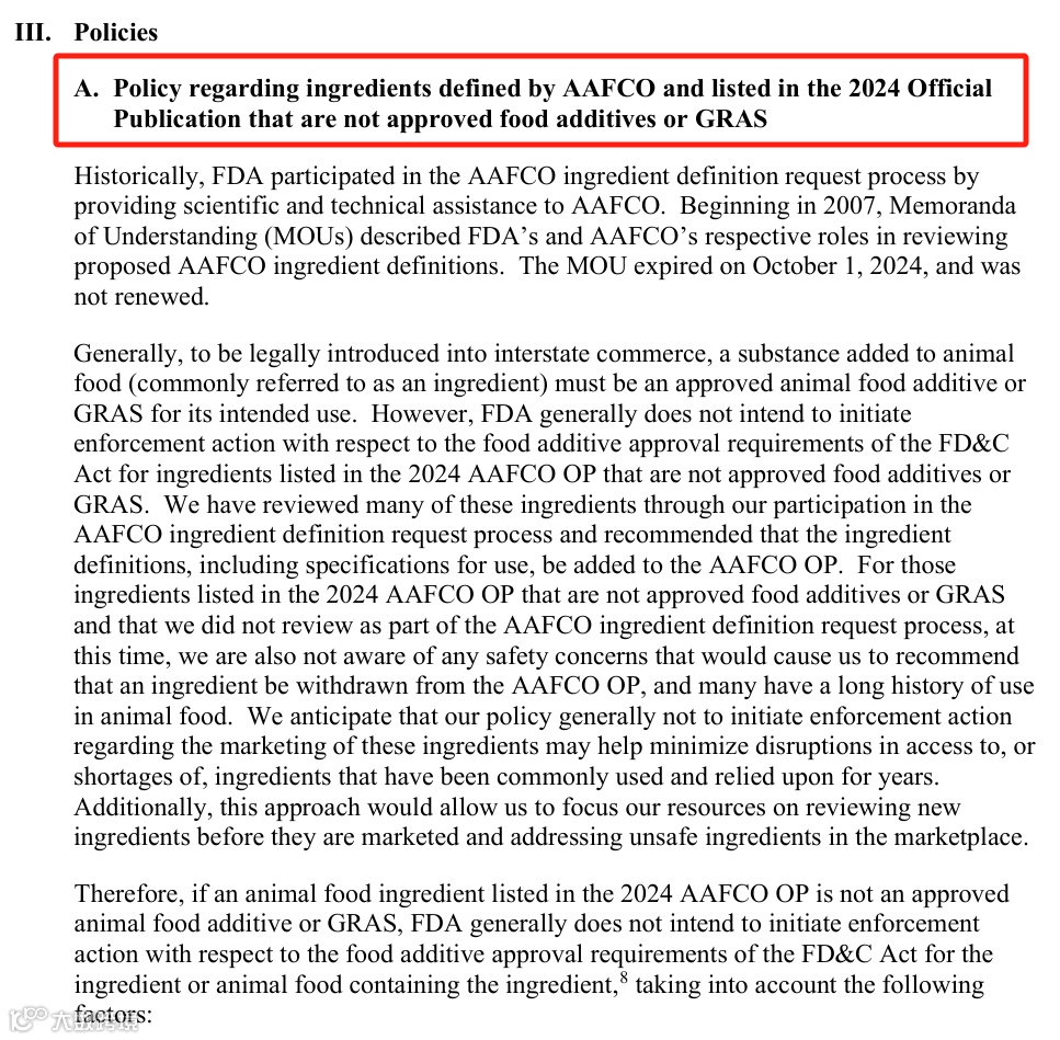 美国饲料工业协会(AFIA)在最终政策发布后也公开向FDA表示感谢。根据 AFIA 的说法,如果没有 GIF #293,在美国境内使用数百种动物饲料和宠物食品成分可能会面临风险。