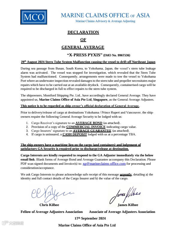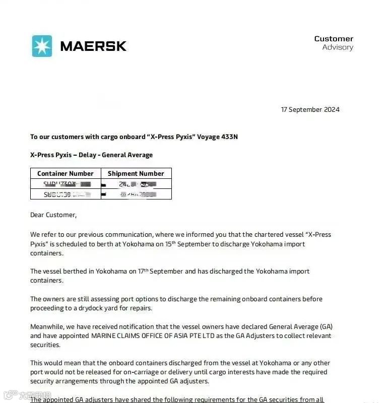 X-PRESS PYXIS轮共舱船公司MSC和马士基向客户发出通知,称已收到通知,X-PRESS PYXIS轮船东已宣布共同海损(GA),这让大量货主货代企业措手不及!