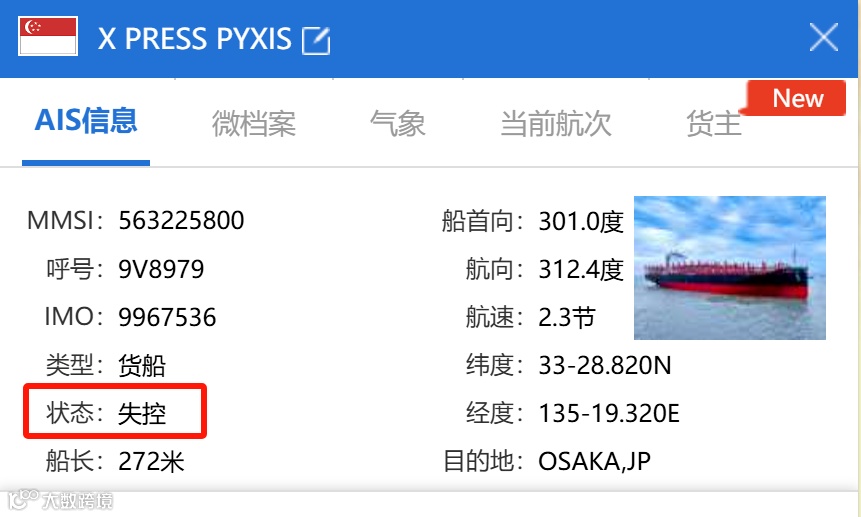 保险公司发布的通知显示,8月29日,集装箱船X-PRESS PYXIS轮在从韩国釜山到日本横滨的航行途中,船舶的艉管泄漏警报被触发。船舶停止航行进行调查,结果显示艉管系统出现故障。