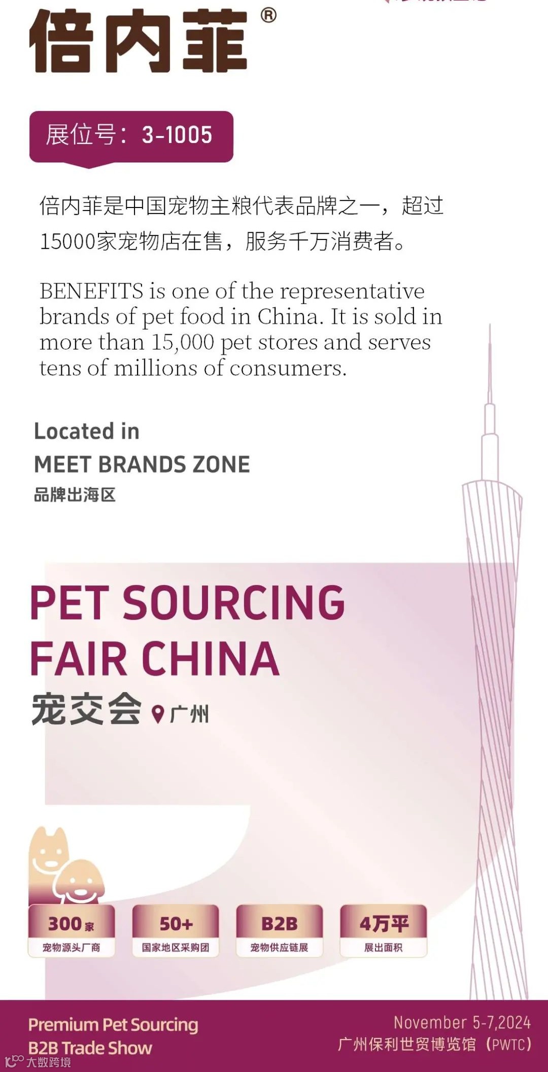 国内领先的宠物主粮品牌倍内菲(展位号:3-1005),已确认参展首届PSC宠交会,并加入品牌出海专区。