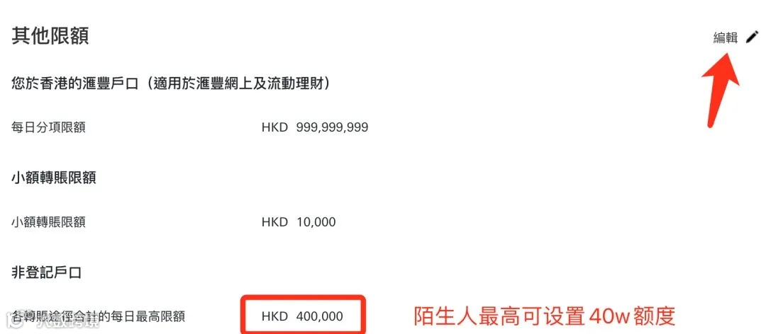 - 如是陌生账户,则支持最高40万港币的转账额度。