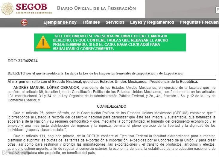 当地时间4月22日,墨西哥总统洛佩斯签署法令,针对钢、铝、纺织品、服装、鞋类、木材、塑料及其制品等544项商品征收5%至50%的临时进口关税。