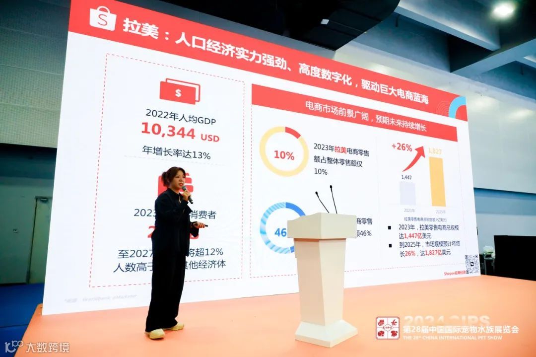Shopee 宠物类目招商及孵化经理 Elaine 庞伊玥以《突破国界,拓展东南亚——宠物类目在 Shopee 的无限可能》为题进行了精彩的主题分享。其指出,东南亚和拉美市场的宠物饲养率较高,尤其是菲律宾、马来西亚、泰国和巴西等站点。数据显示,这些国家的宠物市场超出平均水平,是卖家重点关注的目标市场。