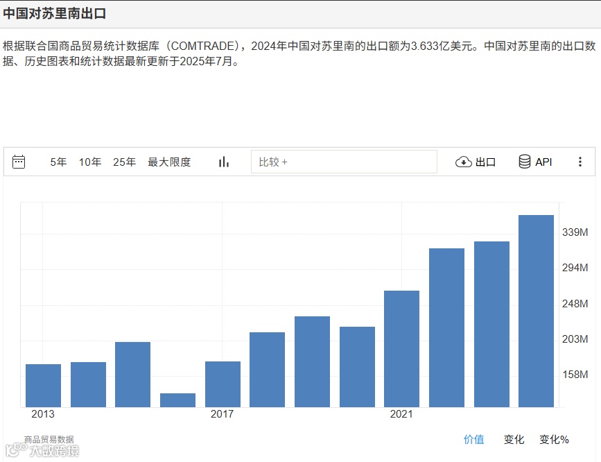 2024年中国出口苏里南出口额为3.6亿美元,基本上出口额度也是每年递增的,中国产品在苏里南的影响力也是不断增强。