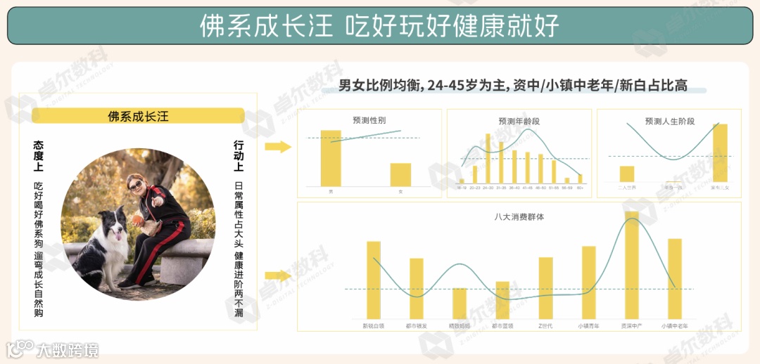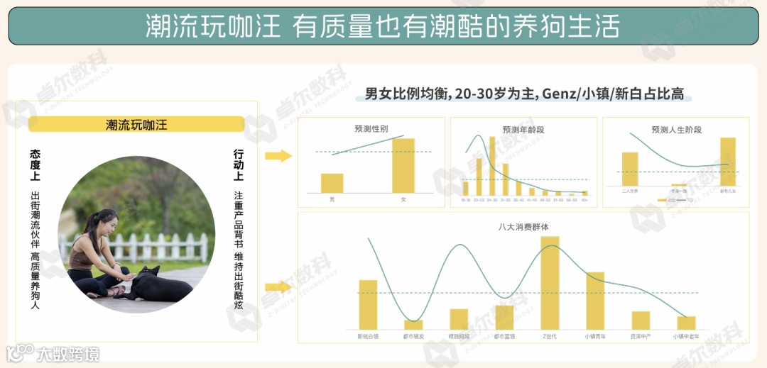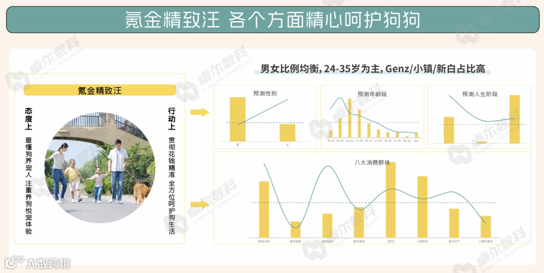 四是“佛系成长汪”。这部分用户大多是传统养狗人,他们尊重狗狗天然生活属性,信奉吃好玩好健康就好的养宠理念。在食品消费类目上,他们以主粮为总体饮食,但可以加餐狗零食。在进阶类目消费上,偏好狗狗日常遛弯需求,消费集中于雨衣项圈等类目。但是相比其他人群,“佛系成长汪”在该类目上的消费还有待挖掘。