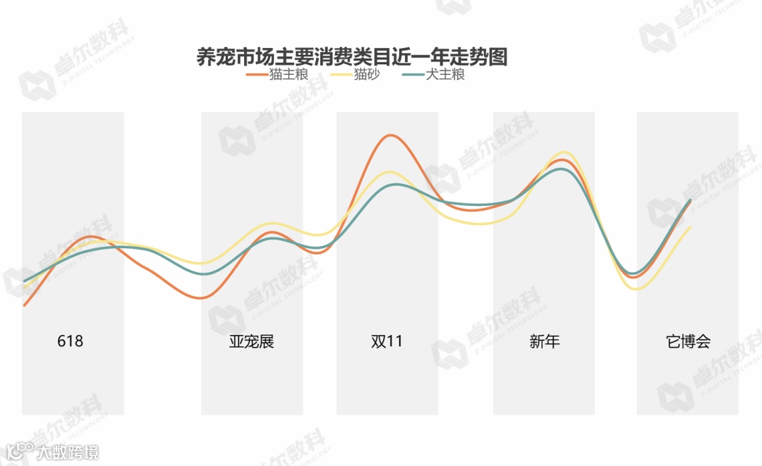 一是从营销节点上来看。通过观察近一年消费数据,发现618、双11、新年期间都出现了消费高点,占全年消费的32%+。同时,在它博会和亚宠展举行期间,养宠市场也呈现环比增长趋势,其中主粮类目增长趋势显著。