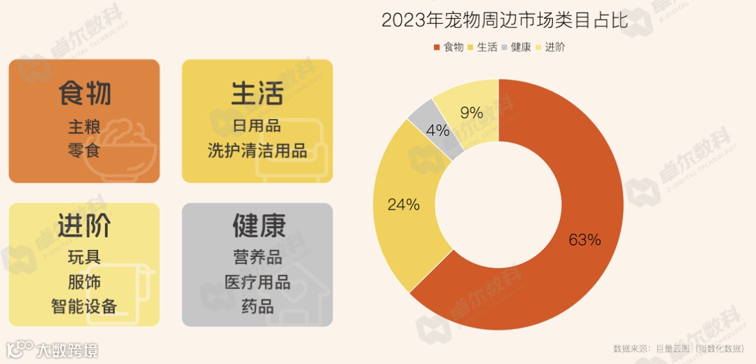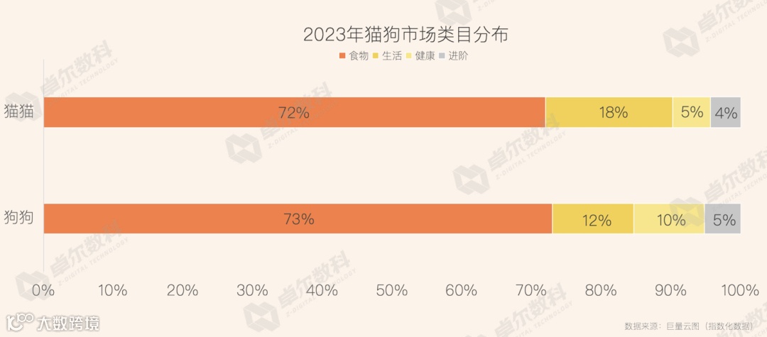 据报告指出,抖音电商已经基本形成围绕猫猫狗狗周边生活的全消费类目。其中,宠物食物和宠物生活占比高达80%,其次是进阶消费和健康消费。