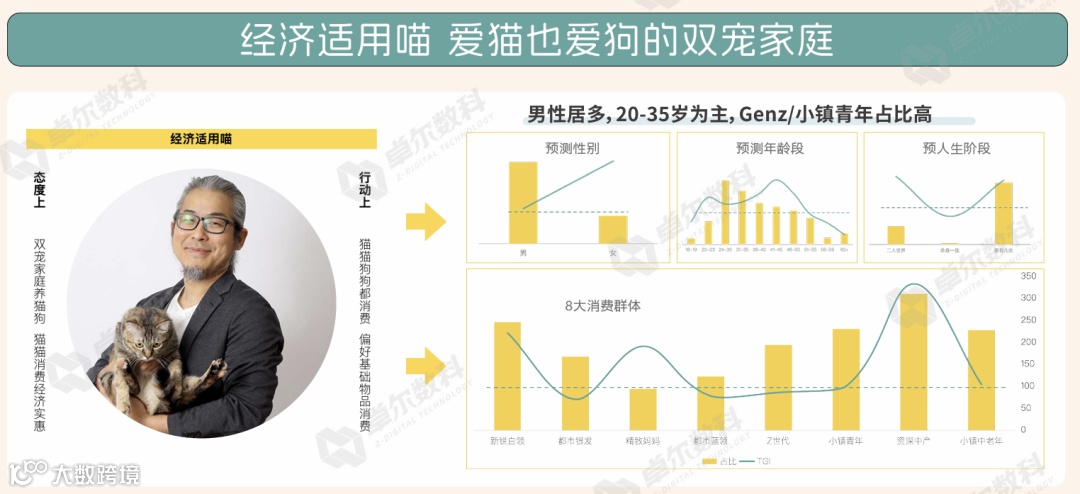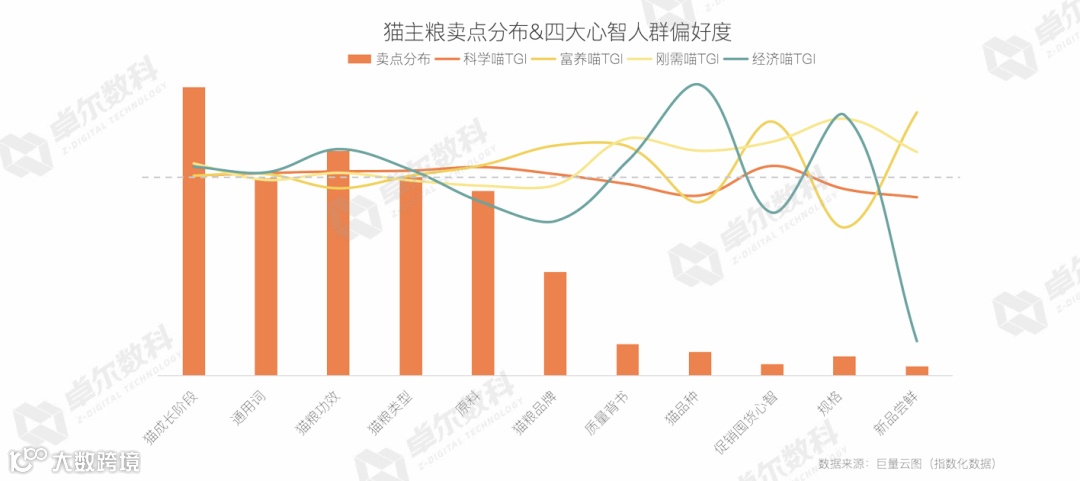 四是“经济适用喵”。这部分人群大多为爱猫也爱狗的双宠家庭,养宠消费偏好是宠物基础和入门消费,一物猫狗两用的高性价比产品。在食品消费类目上,集中于犬主粮、猫狗通用食品、狗零食等产品。猫粮类型更喜欢风干、无谷,偏好高性价比的产品;生活消费偏好则集中在大促囤货&高性价比猫砂方面,相对关注功效和种类。