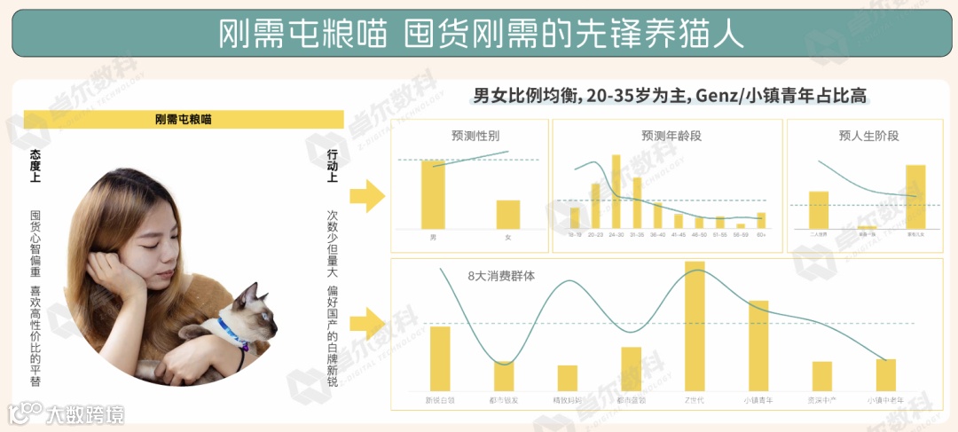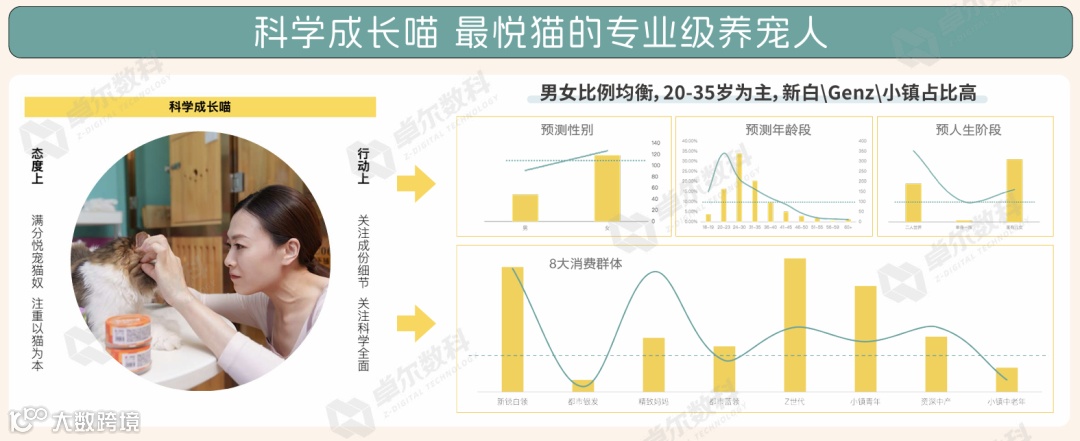 一是“科学成长喵”。这部分用户悦猫属性强,希望猫猫“吃的健康、住的干净”,关注猫咪科学成长。在消费维度上,这部分用户食物消费高频,集中于主粮、零食、罐头、妙鲜包等不同类目,且关注猫粮各个维度的品质;而在宠物生活用品消费类目中,这部分用户大促心智明显,偏好进口猫砂,且猫砂消费相对关注功效和种类。