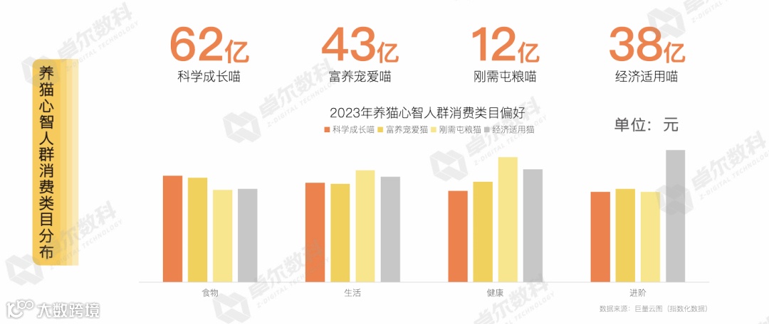 具体来看,四类养猫人群的养宠消费类目主要是食物和生活,且在生活和健康消费上都有较高的偏好度。其中:
