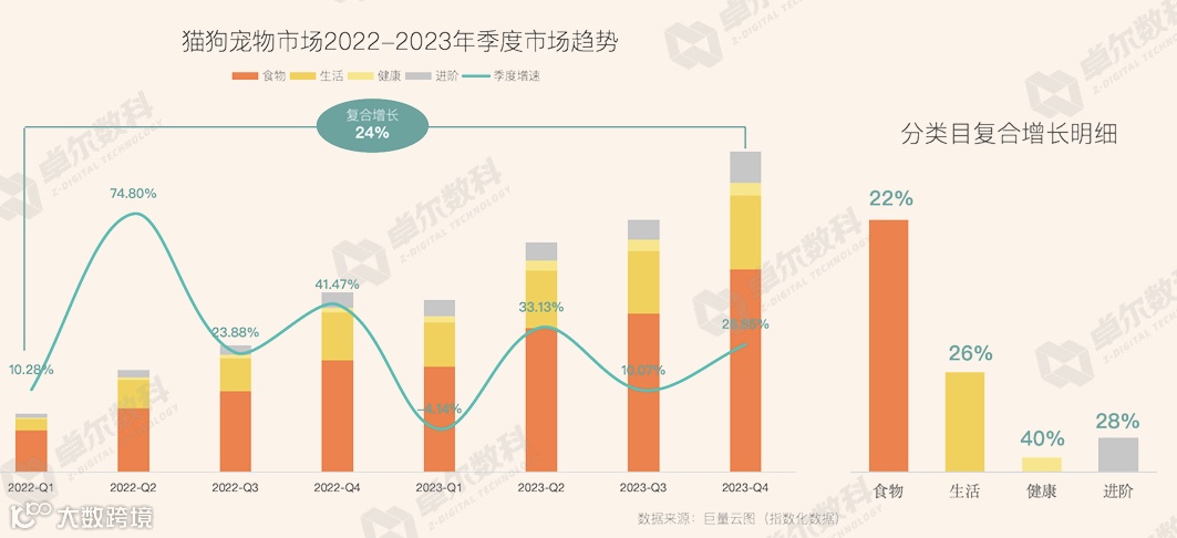 具体到细分类目来看,四大宠物消费类目都在迅猛增长,但健康消费的增速尤为突出。数据显示,自2022年Q1以来,猫狗宠物市场从6亿+迅速增长到季度GMV33亿+,季度复合增长率超过24%,其中健康类目增长速度最为亮眼,复合增长率高达40%。