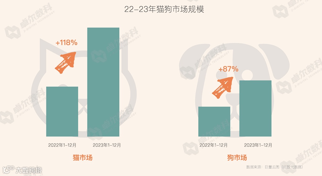 而从犬猫不同维度来看,养猫市场体量超过狗,且猫增速更快。报告指出,2022年和2023年,抖音猫市场总量66亿,狗市场总量34亿。且猫市场季度复合增长率24%,超过狗市场的18%季度复合增长率。