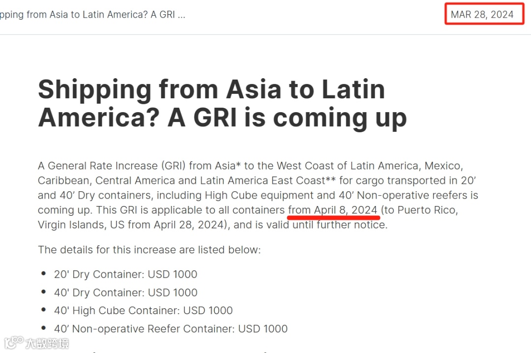 此前报道,3月18日赫伯罗特发布公告,宣布自2024年4月1日起,对亚洲(不包括日本)至拉丁美洲航线运费调涨:小柜涨700美元、大柜涨900美元!